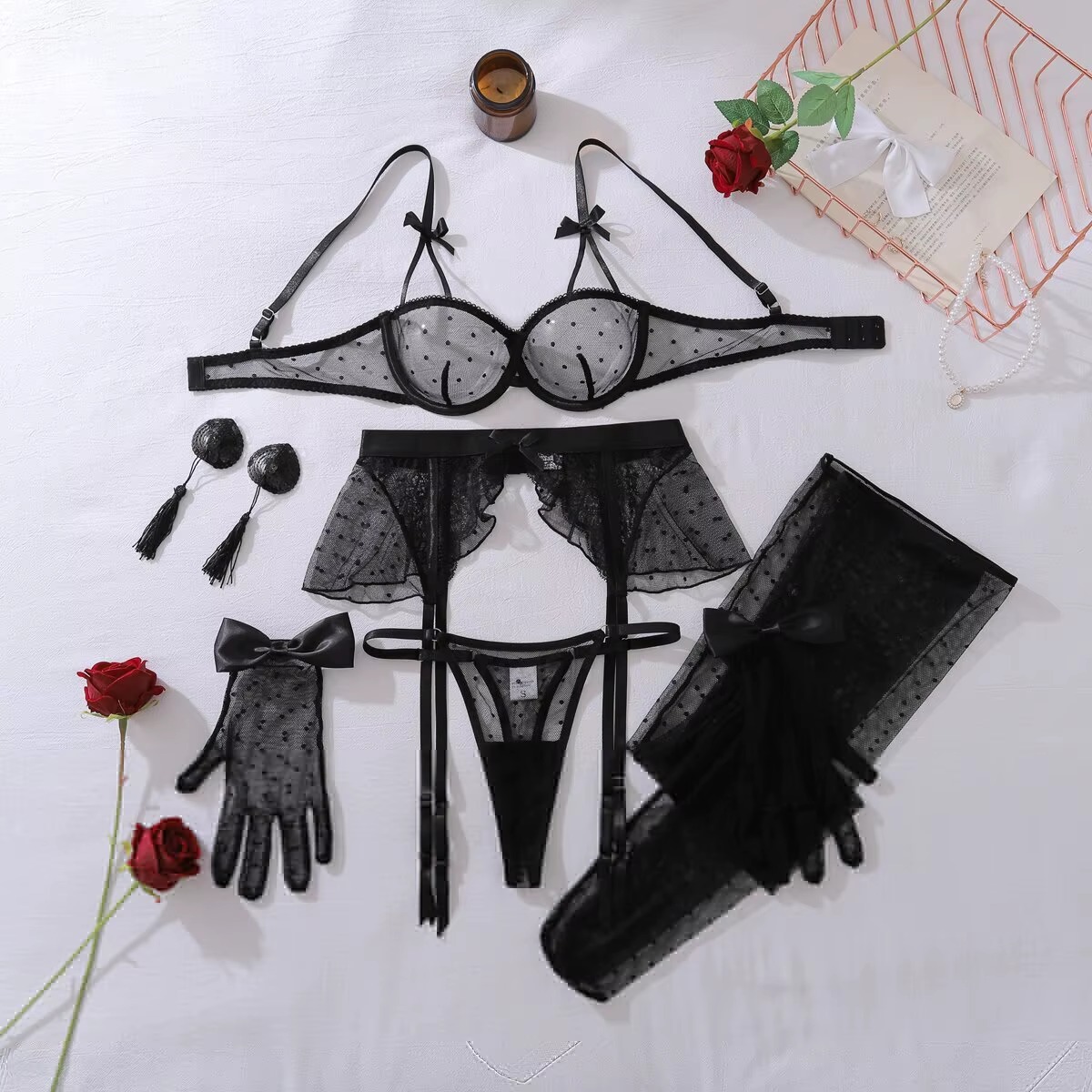 - Incluye liguero, medias, guantes y pezoneras.